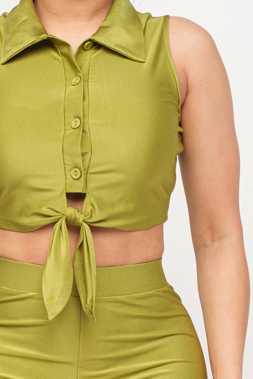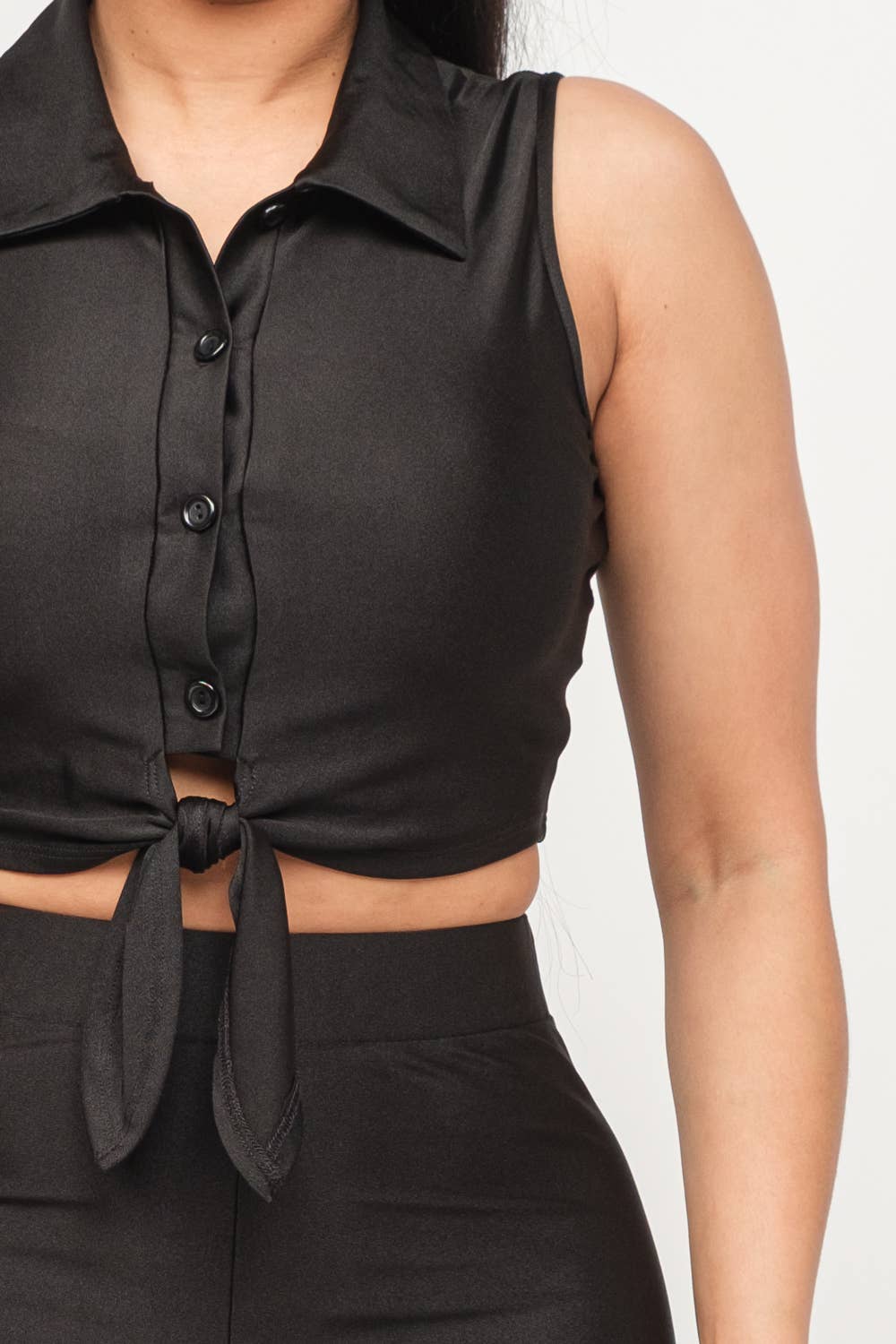 - Functional button down front tie top, collared sleeveless crop top and shorts